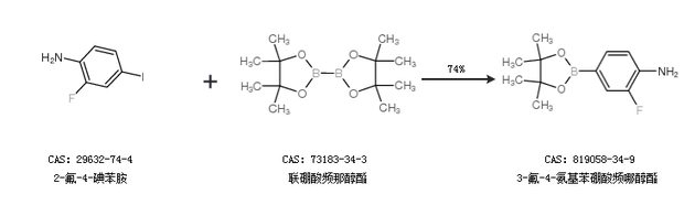 1.通过2-氟-4-碘苯胺和联硼酸频那醇酯合成3-氟-4-氨基苯硼酸频哪醇酯,收率约74%;