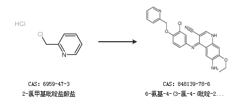 2.通过2-氯甲基吡啶盐酸盐合成6-氨基-4-(3-氯-4-(吡啶-2-取代甲氧基)苯胺)-7-乙氧基喹啉-3-甲腈
