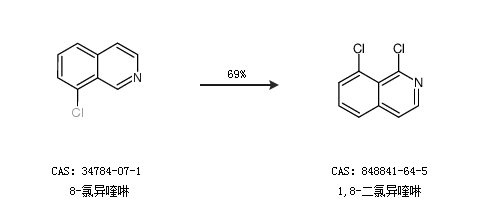 1.通过8-氯异喹啉合成1,8-二氯异喹啉,收率约69%;