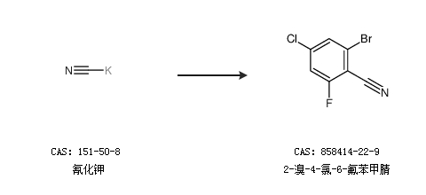 1.通过氰化钾合成2-溴-4-氯-6-氟苯甲腈