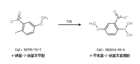 2.通过4-碘基-3-硝基苯甲醚合成4-甲氧基-2-硝基苯基硼酸,收率约73%;