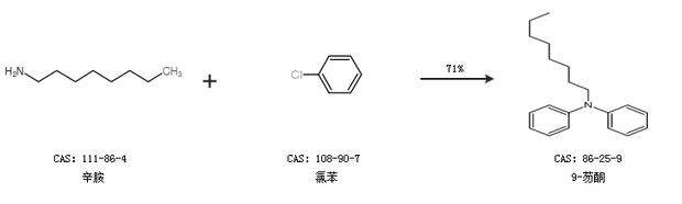1.通过辛胺和氯苯合成9-芴酮,收率约71%;