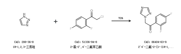 2.通过1H-1,2,3-三氮唑和2-氯-2'',4''-二氟苯乙酮合成2''4''-二氟-2-[1-(1H-1,2,4-三唑基)]苯乙酮,收率约70%;
