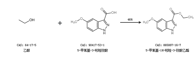 1.通过乙醇和5-甲氧基-3-吲唑羧酸合成5-甲氧基-1H-吲唑-3-羧酸乙酯,收率约46%;