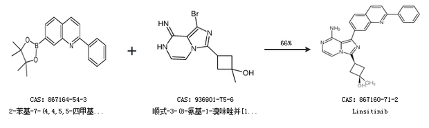 1.通过2-苯基-7-(4,4,5,5-四甲基-1,3,2-二噁硼烷-2-基)喹啉和顺式-3-(8-氨基-1-溴咪唑并[1,5-a]吡嗪-3-基)-1-甲基环丁醇合成Linsitinib,收率约66%;