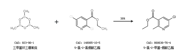 1.通过三甲基环三硼氧烷和5-氯-2-氯烟酸乙酯合成5-氯-2-甲基-烟酸乙酯,收率约38%;