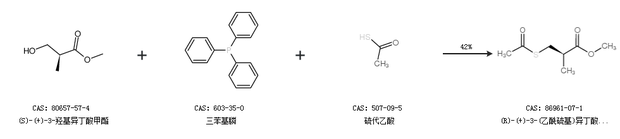 2.通过(S)-(+)-3-羟基异丁酸甲酯、三苯基膦和硫代乙酸合成(R)-(+)-3-(乙酰硫基)异丁酸甲酯,收率约42%;