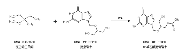 2.通过原乙酸三甲酯和更息洛韦合成O-单乙酰更昔洛韦,收率约72%;