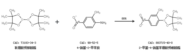 2.通过联硼酸频那醇酯和4-硝基-2-甲苯胺合成2-甲基-4-硝基苯硼酸频哪醇酯,收率约88%;
