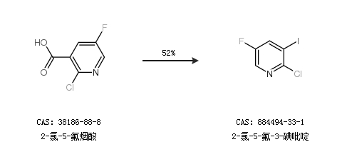 1.通过2-氯-5-氟烟酸合成2-氯-5-氟-3-碘吡啶,收率约52%;