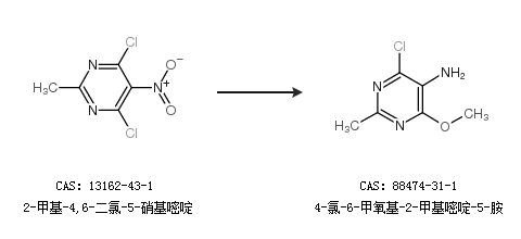 2.通过2-甲基-4,6-二氯-5-硝基嘧啶合成4-氯-6-甲氧基-2-甲基嘧啶-5-胺