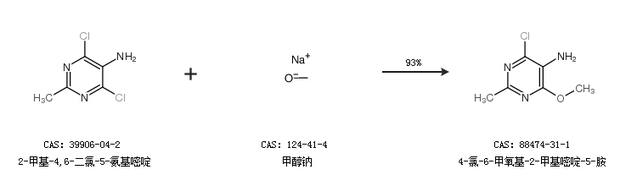 1.通过2-甲基-4,6-二氯-5-氨基嘧啶和甲醇钠合成4-氯-6-甲氧基-2-甲基嘧啶-5-胺,收率约93%;