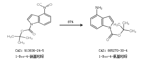 2.通过1-Boc-4-硝基吲哚合成1-Boc-4-氨基吲哚,收率约87%;