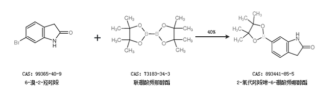 1.通过6-溴-2-羟吲哚和联硼酸频那醇酯合成2-氧代吲哚啉-6-硼酸频哪醇酯,收率约40%;