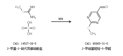 1.通过2-甲基-2-硫代异脲硫酸盐合成2-甲硫基嘧啶-5-甲醛,收率约98%;
