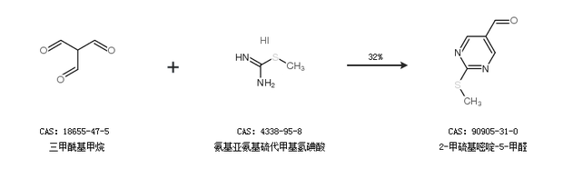 2.通过三甲酰基甲烷和氨基亚氨基硫代甲基氢碘酸合成2-甲硫基嘧啶-5-甲醛,收率约32%;