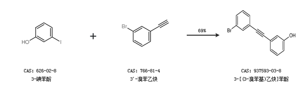 1.通过3-碘苯酚和3''-溴苯乙炔合成3-[(3-溴苯基)乙炔]苯酚,收率约69%;