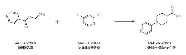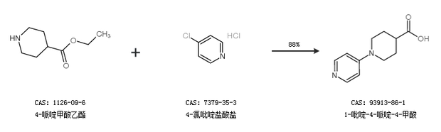 2.通过4-哌啶甲酸乙酯和4-氯吡啶盐酸盐合成1-吡啶-4-哌啶-4-甲酸,收率约88%;