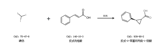 2.通过碘仿和反式肉桂酸合成反式-2-苯基环丙烷-1-羧酸,收率约81%;