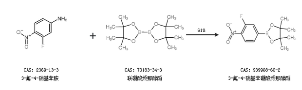 2.通过3-氟-4-硝基苯胺和联硼酸频那醇酯合成3-氟-4-硝基苯硼酸频那醇酯,收率约61%;