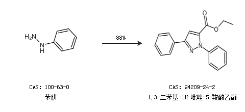 1.通过苯肼合成1,3-二苯基-1H-吡唑-5-羧酸乙酯,收率约88%;