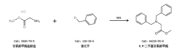 1.通过甘氨酸甲酯盐酸盐和溴化苄合成N,N-二苄基甘氨酸甲酯,收率约88%;