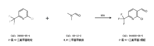 2.通过2-氯-6-三氟甲基吡啶和N,N-二甲基甲酰胺合成2-氯-6-(三氟甲基)烟醛,收率约95%;