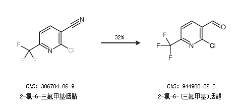 1.通过2-氯-6-三氟甲基烟腈合成2-氯-6-(三氟甲基)烟醛,收率约32%;