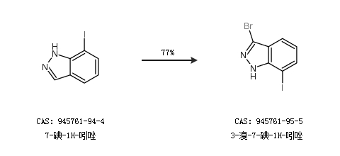 1.通过7-碘-1H-吲唑合成3-溴-7-碘-1H-吲唑,收率约77%;