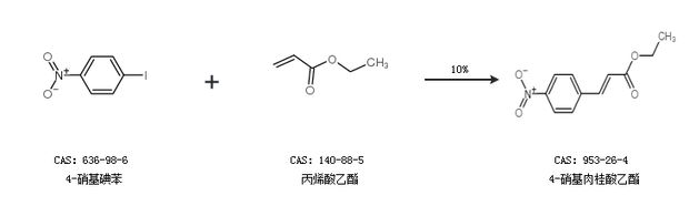 1.通过4-硝基碘苯和丙烯酸乙酯合成4-硝基肉桂酸乙酯,收率约10%;