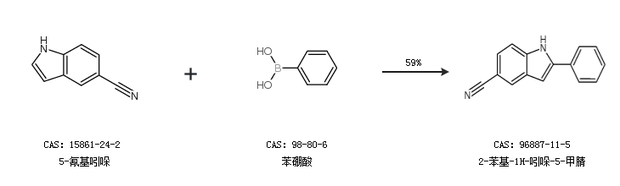 2.通过5-氰基吲哚和苯硼酸合成2-苯基-1H-吲哚-5-甲腈,收率约59%;