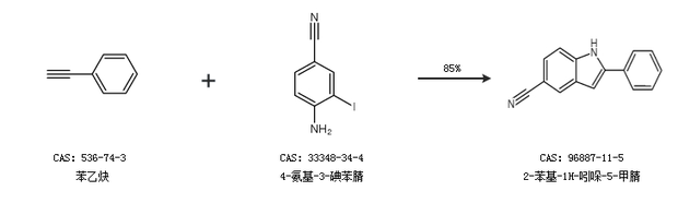 1.通过苯乙炔和4-氨基-3-碘苯腈合成2-苯基-1H-吲哚-5-甲腈,收率约85%;