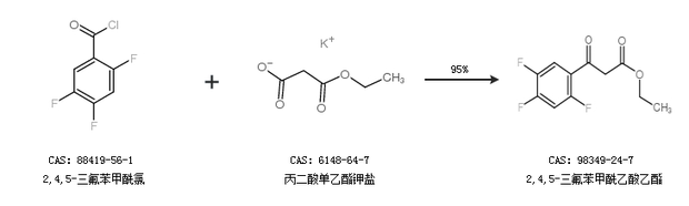 2.通过2,4,5-三氟苯甲酰氯和丙二酸单乙酯钾盐合成2,4,5-三氟苯甲酰乙酸乙酯,收率约95%;