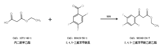 1.通过丙二酸单乙酯和2,4,5-三氟苯甲酰氯合成2,4,5-三氟苯甲酰乙酸乙酯,收率约99%;