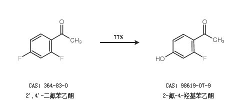 1.通过2'',4''-二氟苯乙酮合成2-氟-4-羟基苯乙酮,收率约77%;