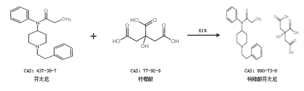 1.通过芬太尼和柠檬酸合成枸橼酸芬太尼,收率约61%;