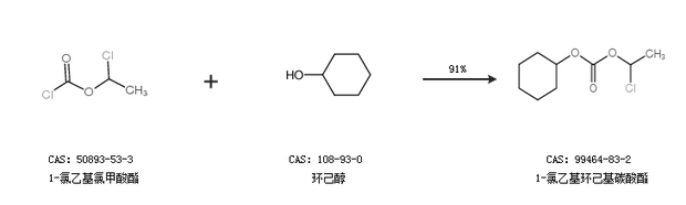 1.通过1-氯乙基氯甲酸酯和环己醇合成1-氯乙基环己基碳酸酯,收率约91%;