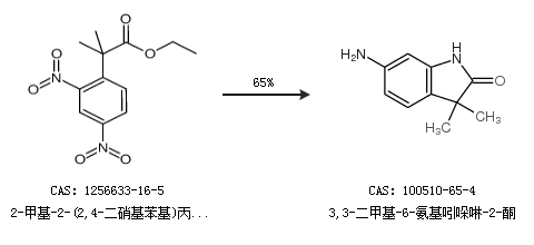 2.通过2-甲基-2-(2,4-二硝基苯基)丙酸乙酯合成3,3-二甲基-6-氨基吲哚啉-2-酮,收率约65%;