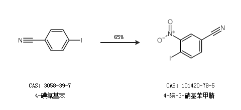 1.通过4-碘氰基苯合成4-碘-3-硝基苯甲腈,收率约65%;