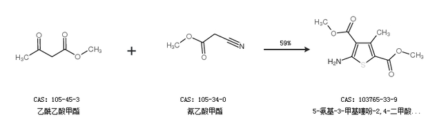 1.通过乙酰乙酸甲酯和氰乙酸甲酯合成5-氨基-3-甲基噻吩-2,4-二甲酸二甲酯,收率约59%;