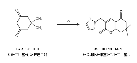1.通过5,5-二甲基-1,3-环己二酮合成3-(呋喃-2-甲基)-7,7-二甲基-7,8-二氢-2H-色烯-2,5(6H)-二酮,收率约79%;