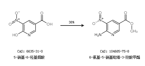 1.通过5-硝基-6-羟基烟酸合成6-氨基-5-硝基吡嗪-3-羧酸甲酯,收率约38%;
