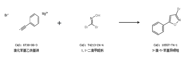 2.通过溴化苯基乙炔基镁和1,1-二溴甲醛肟合成3-溴-5-苯基异噁唑