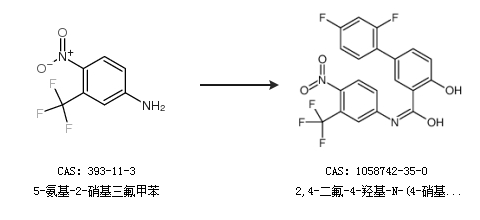 1.通过5-氨基-2-硝基三氟甲苯合成2,4-二氟-4-羟基-N-(4-硝基-3-(三氟甲基)苯基)联苯-3-羧酰胺