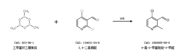 1.通过三甲基环三硼氧烷和2,4-二氯烟醛合成4-氯-2-甲基吡啶-3-甲醛,收率约16%;