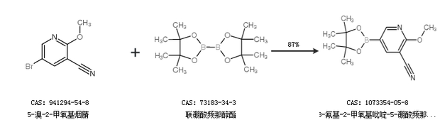 1.通过5-溴-2-甲氧基烟腈和联硼酸频那醇酯合成3-氰基-2-甲氧基吡啶-5-硼酸频那醇酯,收率约87%;