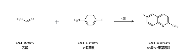 2.通过乙醛和4-氟苯胺合成6-氟-2-甲基喹啉,收率约40%;