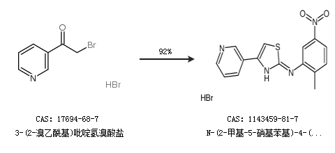1.通过3-(2-溴乙酰基)吡啶氢溴酸盐合成N-(2-甲基-5-硝基苯基)-4-(3-吡啶基)-2-噻唑胺氢溴酸盐,收率约92%;