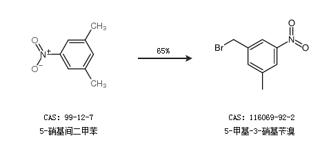 2.通过5-硝基间二甲苯合成5-甲基-3-硝基苄溴,收率约65%;