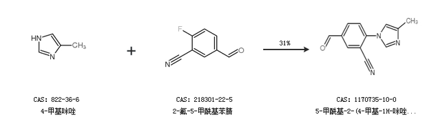 1.通过4-甲基咪唑和2-氟-5-甲酰基苯腈合成5-甲酰基-2-(4-甲基-1H-咪唑-1-基)-苯甲腈,收率约31%;